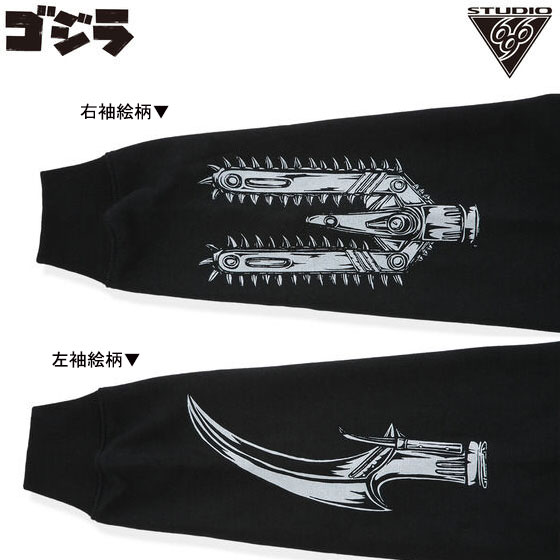 SUTDIO696のゴジラシリーズ。ご要望にお応えしてパーカーアイテムで登場!ガイガン2004デザイン。両袖には各種武装がデザイン!(プルオーバータイプ)