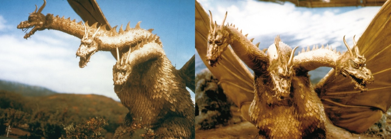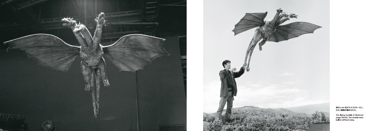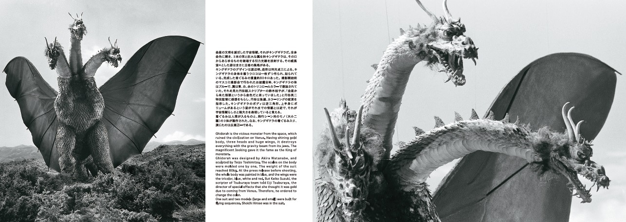 Ghidorah in this issue appeared in “Ghidorah the Three-Headed Monster”(1964). Having three heads, it is one of the most popular villains of the GODZILLA series with its unique design of the mixture of Western and Eastern taste, outstanding performance by the suits actors and the technics of special effects. We hope you enjoy the design of Ghidorah with these snapshots and still pictures taken during the filming.