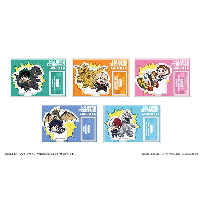 ゴジラシリーズの怪獣たちとヒロアカキャラクターたちのコラボレーションビジュアルを使用した各種グッズが登場。