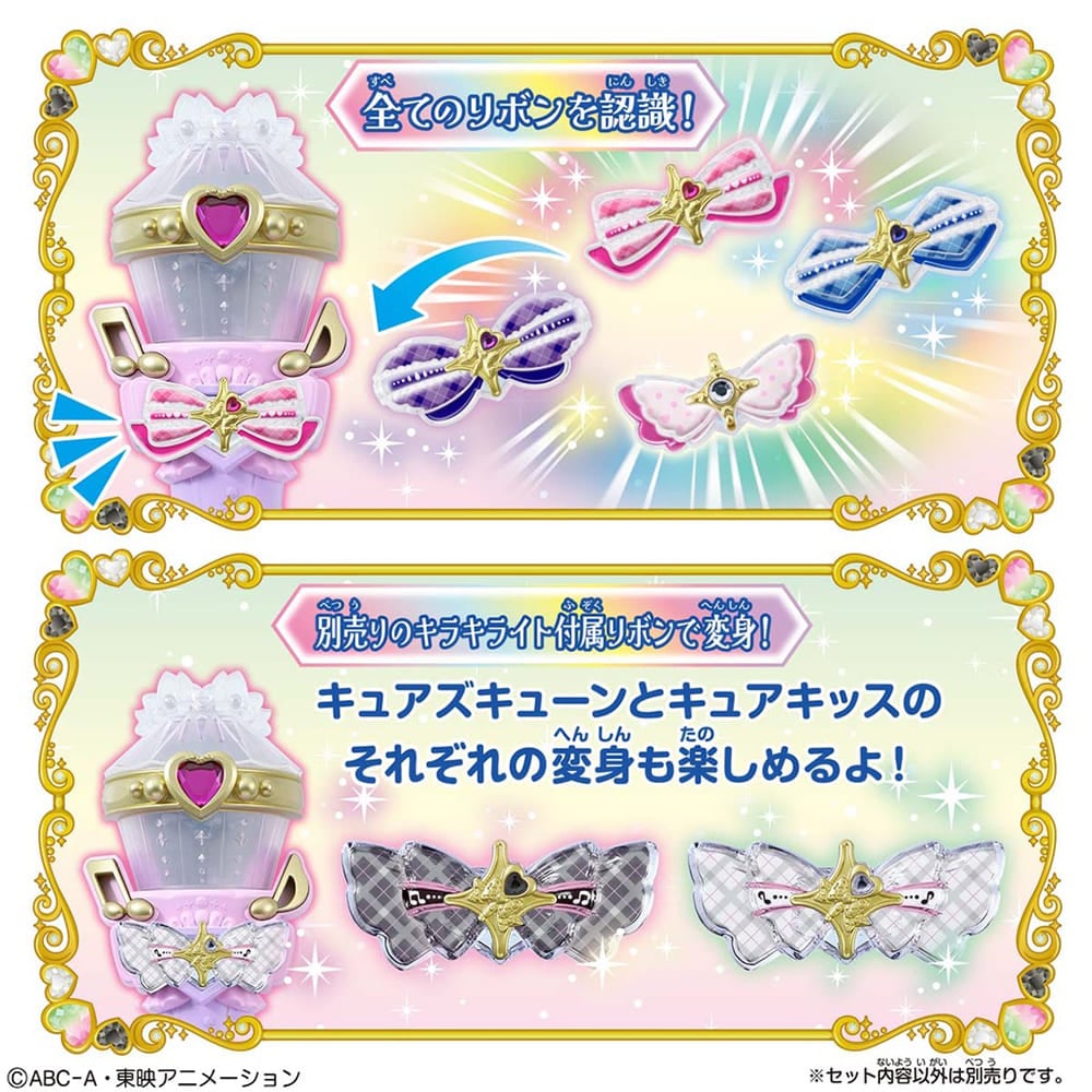 別売りの「キミとおうえん♪キラキライト キュアズキューン」や、「キミとおうえん♪キラキライト キュアキッス」に付属のリボンをセットすることで、キュアズキューンとキュアキッスそれぞれの変身遊びも楽しめます。