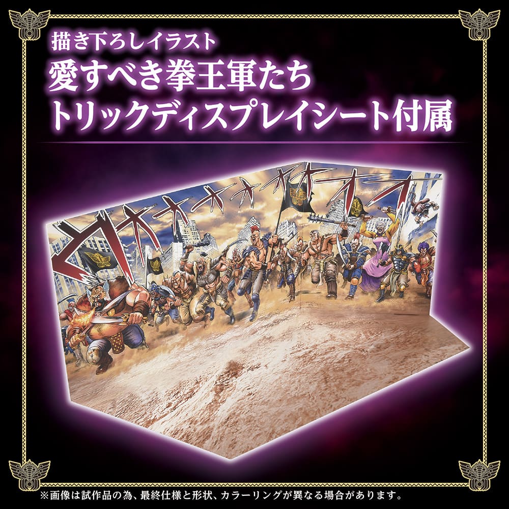 ゾイド本体と同スケールで並べられるラオウのアクリルスタンドや、セット内容全体が一枚のイラストかのように見える拳王軍のトリックディスプレイシートも同梱。