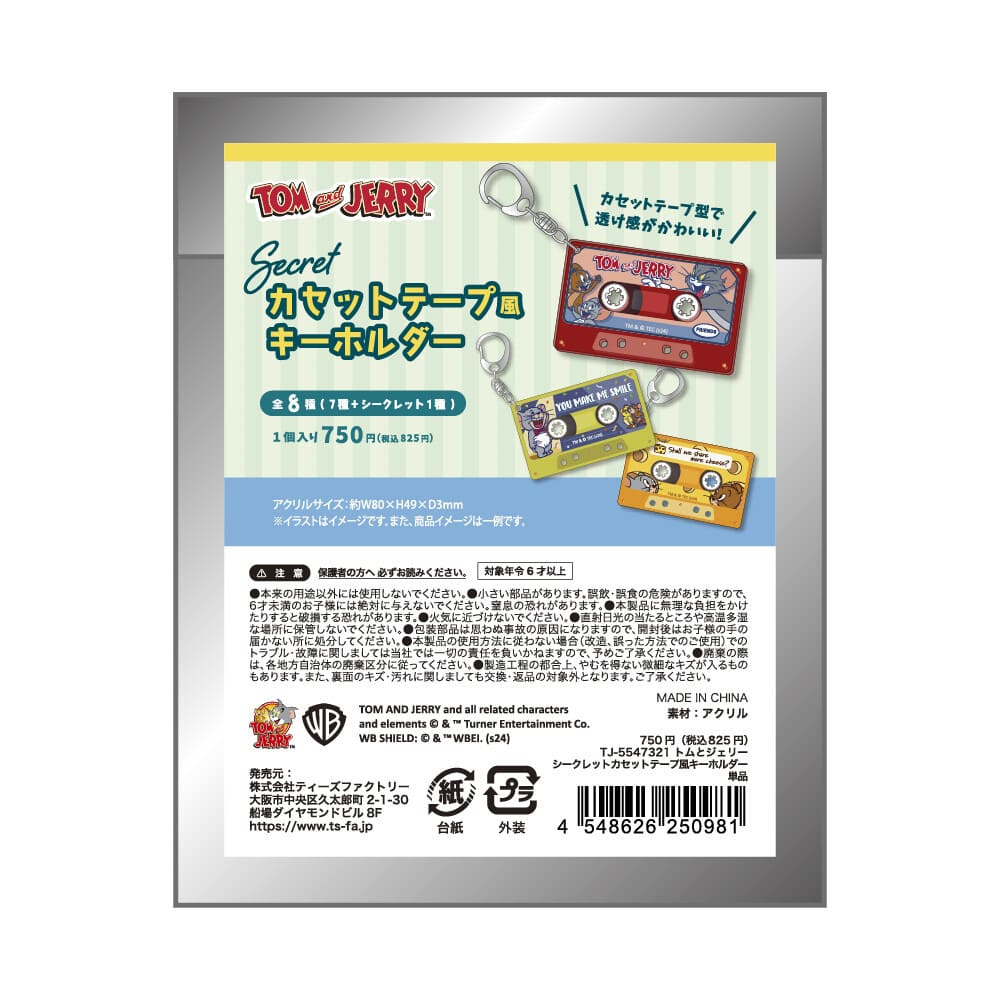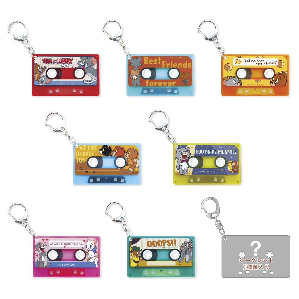 トム&ジェリーのキャラクターたちがデザインされたカセットテープ風キーホルダー。